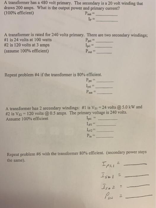 Correcting that for 120 volts instead of 76 that becomes 031 VT 12076 0489 VTSo the 120 volt winding has 120 V 0489 VT 245 turns the 480 would have 4 times as many or 980 turns. K 11000 440 2754. Common efficiencies for transformers4if the secondary of the transformer in question 2 above supplies a current of 96 amperes to a load.